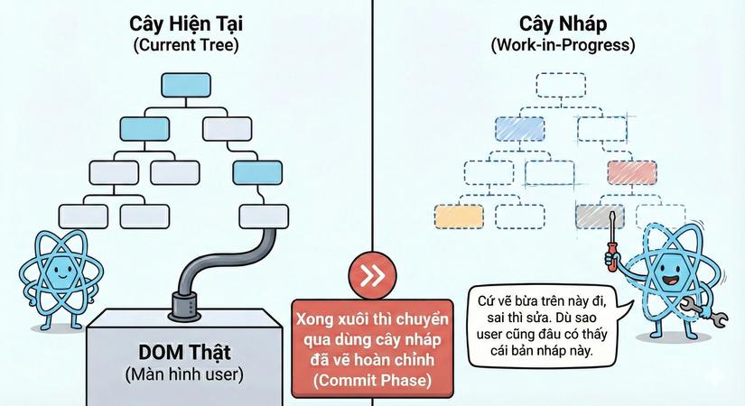 Chỉ khi nào bản nháp hoàn hảo, nhất quán, không lỗi lầm, React mới nhảy qua dùng cây mới đã vẽ xong (Commit phase) để ụp cái UI mới lên màn hình